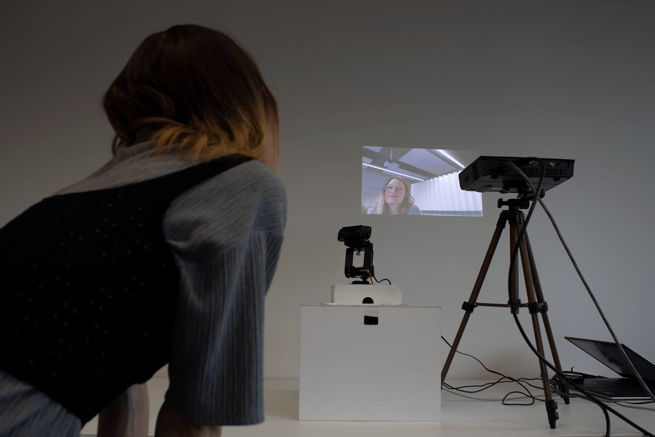Cheerleader tracks the observer’s face with a camera and replicates it in an enlarged projection. This installation addresses the constant surveillance users face on social media and the phenomenon of filter bubbles. By confronting the observer with their own image, it echoes how algorithms continuously reflect users’ perspectives back at them, validating rather than questioning their worldview.